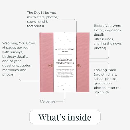 Thương hiệu DUNCAN & STONE PAPER CO. là cái tên nổi tiếng được rất nhiều khách hàng trên thế giới chọn lựa. Với kiểu dáng đẹp mắt, sang trọng, sản phẩm Childhood Memory Book - Elegant Child Memory Book from Pregnancy to Age 18 W/Prompts, Space for Photos & More - Baby Journal (175 Pages, Dusty Rose) là sự lựa chọn hoàn hảo nếu bạn đang tìm mua một món cho riêng mình.