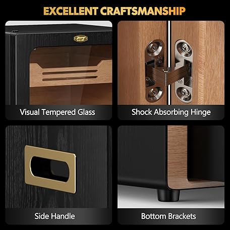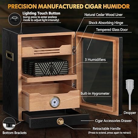 Thông tin sản phẩm Cigar Humidor, Desktop Cigar Humidor Cabinet Light Control System with Spanish Cedar Wood Shelves, Hygrometer, 3 Humidifiers and Cigar Accessories Drawer, Father's Day Gift for Men (Black)