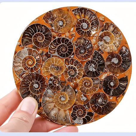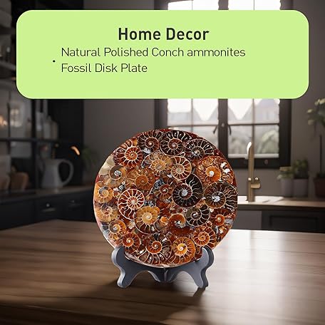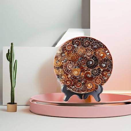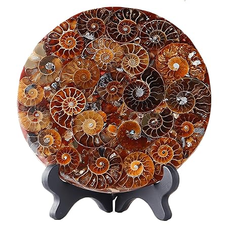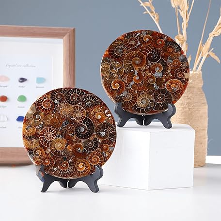 Cintoko Natural Ammonite Fossil Disc with Stand Set, Feng Shui Decor Shell Slice Disc Conch Mineral Specimen Ornament for Home