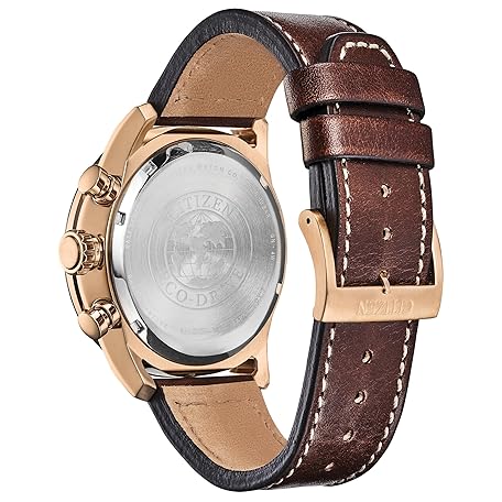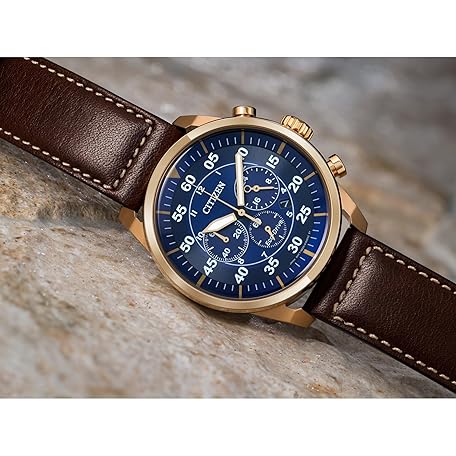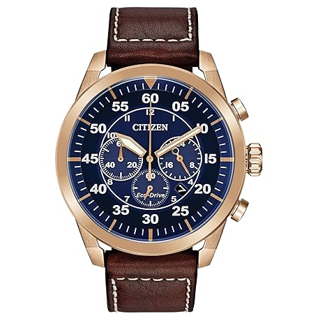 Thông tin sản phẩm Citizen Men's Eco-Drive Chronograph Sport Casual Avion Watch, Rose Gold Stainless Steel with Brown Leather Strap, Blue Dial (Model: CA4213-18L)