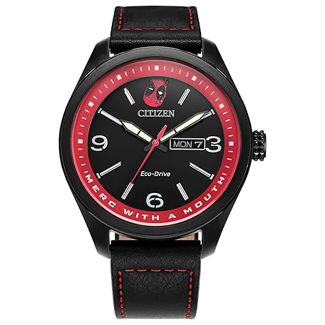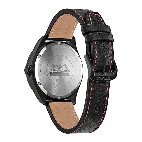 Thông tin sản phẩm Citizen Men's Eco-Drive Marvel 'Here Comes Deadpool' Black Ion Plated Stainless Steel Case with Black Leather Strap Watch,Black Dial,42mm (Model: AW0145-02W)