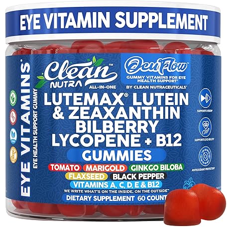 Clean Nutra Lutein and Zeaxanthin Eye Vitamins Gummies + Bilberry for Eyes Vision Support Ginkgo Biloba Marigold, Vitamin B12 Flaxseed Black Pepper CoQ10 Vitamin A l 60 Count B OcuFlow