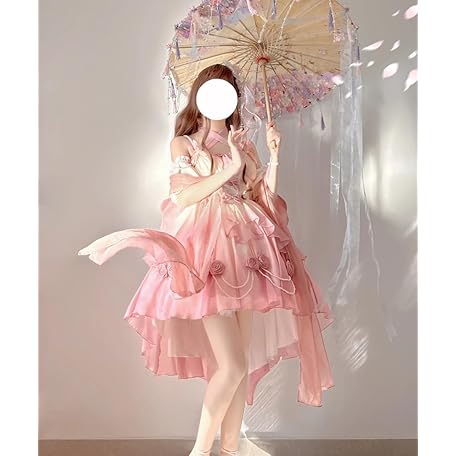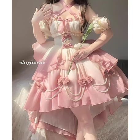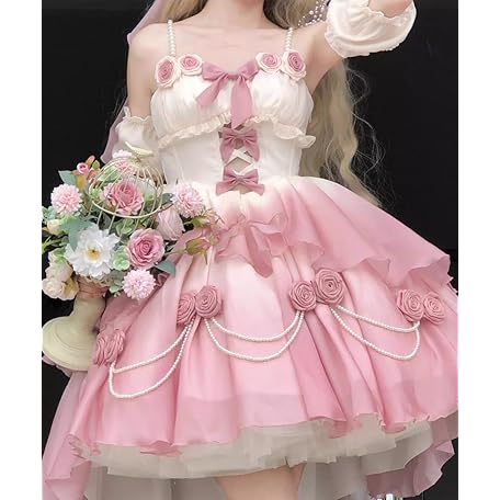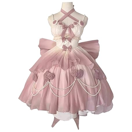 Clivetalos Pink Lolita Dress for Women Girls, Kawaii Princess Dress for Cosplay Costumes, Lace Layers Maid Outfit Sleeveless