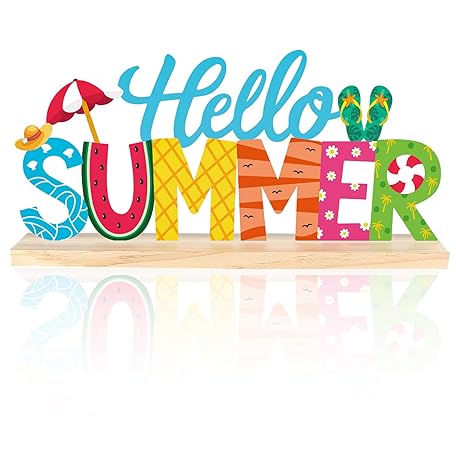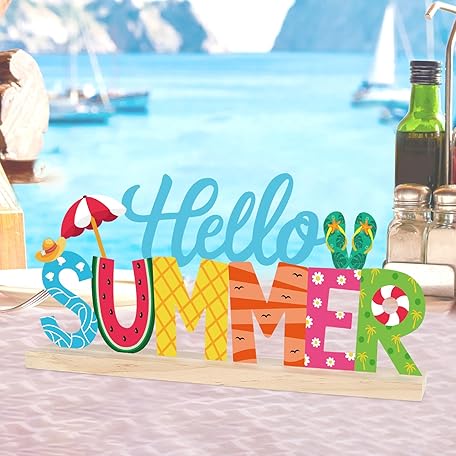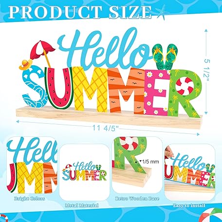 COCHIE COCHIE Metal Hello Summer Sign, Summer Decorations for Home, Office, Shelf, Mantel, Indoor, Beach Slippers Tabletop Centerpiece Decoration, Watermelon Red Decor (Beach)
