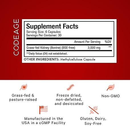Thông tin sản phẩm Codeage Grass Fed Beef Kidney Supplement - Freeze Dried, Non-Defatted, Desiccated Glandulars Nutrition Bovine Pills – Pasture Raised Beef Vitamins - Non-GMO -180 Capsules