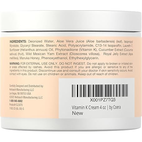 Thông tin sản phẩm Coera Vitamin K Cream 4 oz | Premium Formula for Bruises, Spider Veins, Dark Circles, Broken Capillaries, Eyes, and Face | Paraben and SLS Free