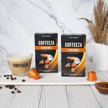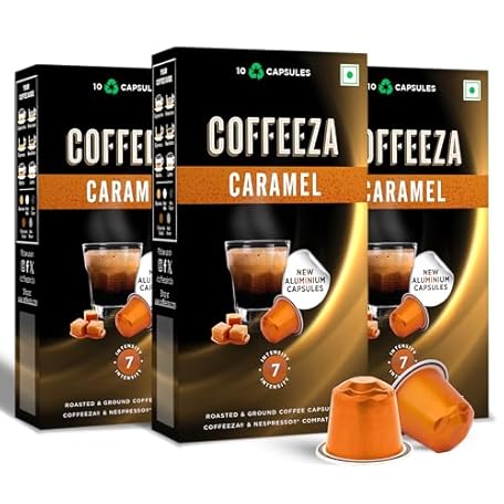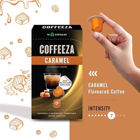 Thông tin sản phẩm Coffeeza Caramel Flavored coffee pods | Intensity – 7, 100% Arabica Aluminium Coffee Pods, 3 Pack - 30 Flavoured Pods (Compatible with OriginalLine Machines only*)