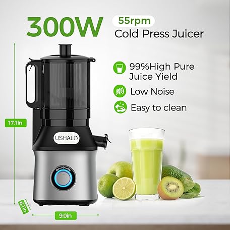Thông tin sản phẩm Cold Press Juicer, USHALO Juicer Machines with 5.5" Extra Large Feed Chute, 300W Slow Masticating Juicer for Whole Vegetables and Fruits, 99% High Juice Yield, Easy to Clean