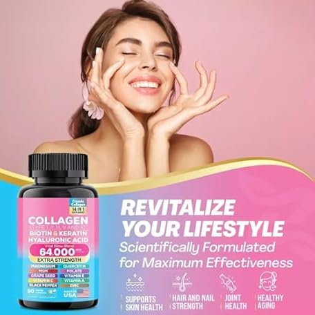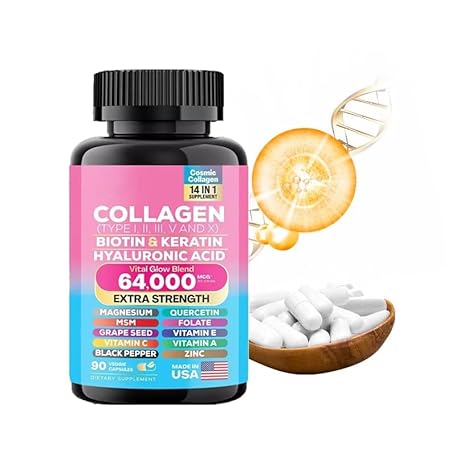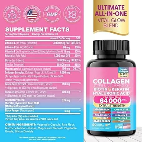 Collagen Peptides Types I, II, III, V & X, 64000 MCG, 14 in 1, Biotin, Keratin, Hyaluronic Acid, Magnesium, MSM, Grape Seed, Vitamin A C & E, Black Pepper, Quercetin, Folate, Zinc (90 Veggie Caps)