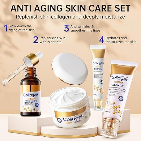 Collagen Skin Care Set, Anti Aging Skincare Set for Reduce Wrinkles, Shrink Pores, Smooth Fine Lines, Hydrating, 4 Pcs Travel Skincare Kits for Women with Cleanser, Serum, Cream, Eye Cream.