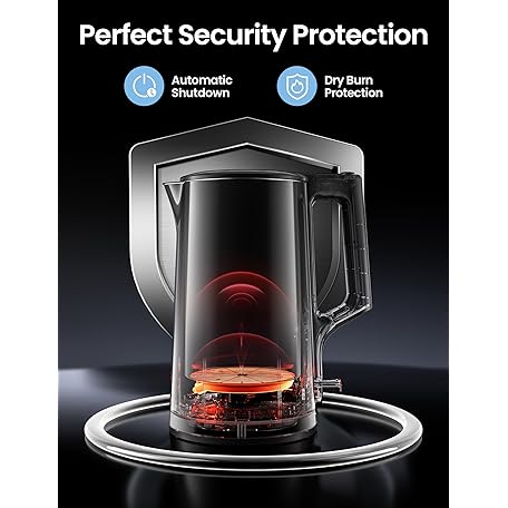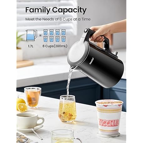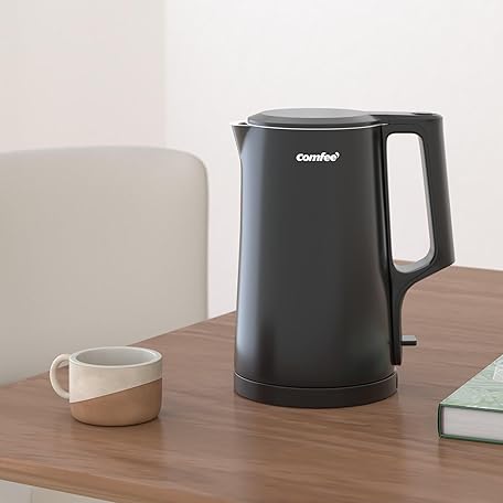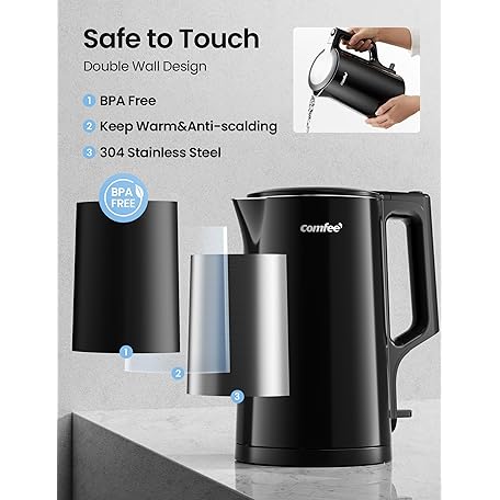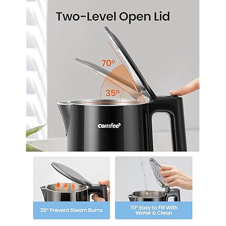 Thông tin sản phẩm COMFEE' 1.7L Double Wall Electric Tea Kettle and Kettle Water Boiler, 100% Stainless Steel Interior & Lid & Spout, Two-Level Wide Open Lid, 1500W Fast Boiling, Auto-Off and Boil-Dry Protection