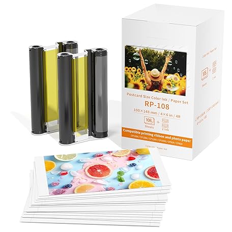 Compatible with Canon RP-108 Color Ink/Paper Set, 2 Color Ink and 108 Sheets 4x6 Photo, Compatible with Canon Selphy CP1300 CP1500 Photo Paper RP-108IN for CP910/CP820/CP1200/CP1300/CP1500