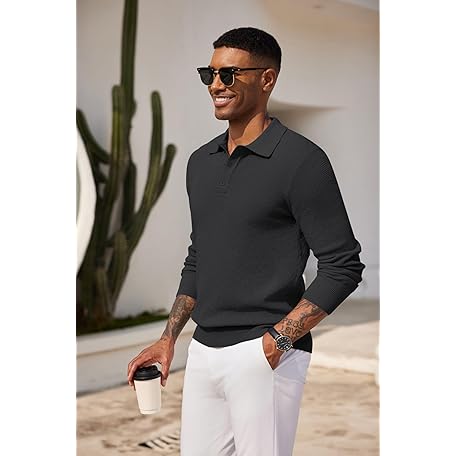 COOFANDY Mens Knit Polo Shirts Long Sleeve Casual Polo Sweaters Shirt Waffle Textured Collared Sweater
