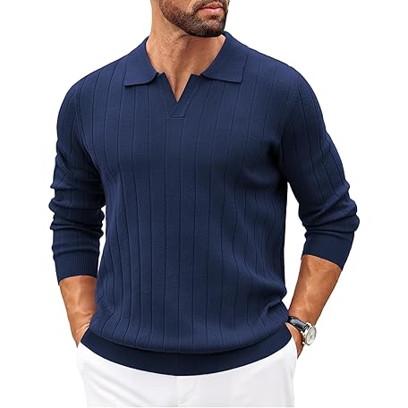 COOFANDY Mens Sweaters Polos Long Sleeve V Neck Knit Polo Lightweight Casual Pullover Sweater