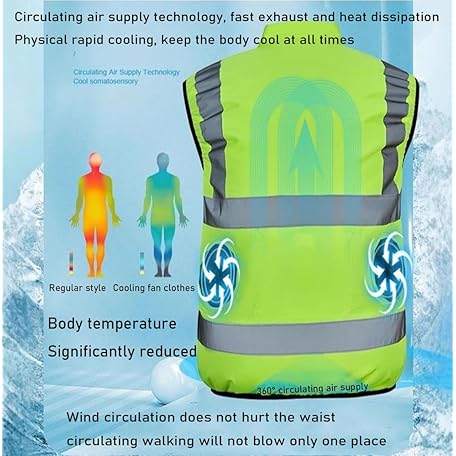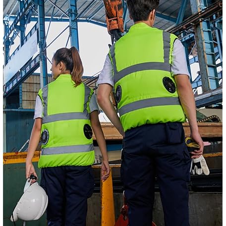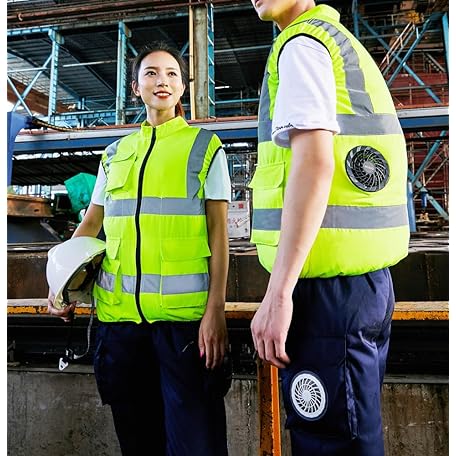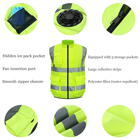 Cooling high visibility vest,Air Conditioned Wearable Fan Cool safety vest for men USB charging 4 Pockets Class 2 High Visibility Zipper Front 13 Hours Cooling reflective safety vests,Yellow-L