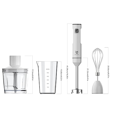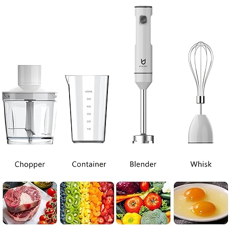 Thông tin sản phẩm Cordless Hand Blender, UTALENT Variable Speed Immersion Blender Rechargeable, with 500ml Chopper, 600ml container, Egg Whisk, for Smoothies, Baby Food and Soups – White