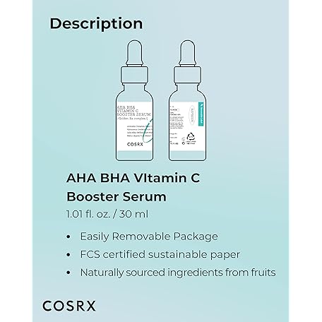 Thông tin sản phẩm COSRX AHA BHA Vitamin C Booster Serum 1.01fl.oz/30ml, Anti Aging, Plumping, Hydrating Serum with Niacinamide, Not Tested on Animals, No Parabens, Korean Skincare