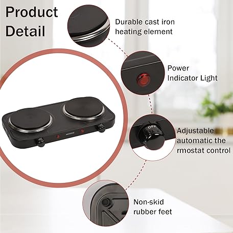 Thông tin sản phẩm Countertop Double Cast Iron Burner 1800 Watts Electric Hot Plate with Adjustable Temperature 6.1" Cooktop for Dorm, Office, Home, Camp, Compatible for All Cookwares