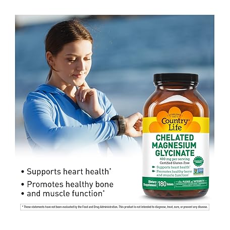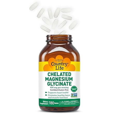 Thông tin sản phẩm Country Life Chelated Magnesium Glycinate 400mg – High Absorption Magnesium Supplement for Muscle Relaxation, Energy, Bone & Immune Support – Gluten-Free, Vegan, Halal, Non-GMO Verified - 180 Tablets