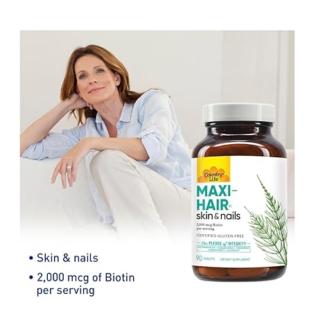 Thông tin sản phẩm Country Life Maxi-Hair Supplement - 2000mcg Biotin & Vitamins for Hair, Skin & Nails - Certified Gluten-Free & Vegetarian - Supports Hair Growth, 90 Tablets