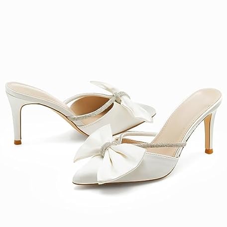 • Coutgo Womens Bow Heels Mules Pointed Closed Toe Sandals Rhinestone Satin Backless Wedding Shoes