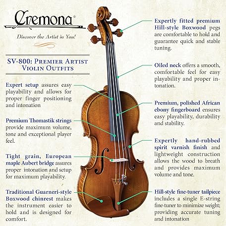 Thông tin sản phẩm Cremona SV-800 4/4 Premier Artist Violin Outfit – Bow & Case Included, Hand-Carved Tonewoods, Hill-Style Fittings, Thomastik Dominant Strings
