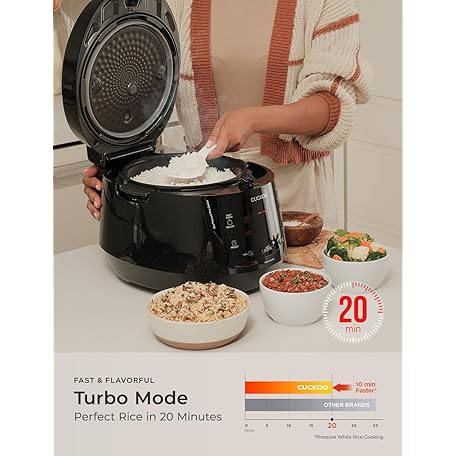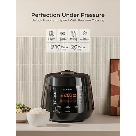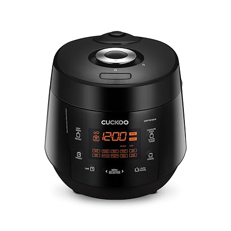 Thông tin sản phẩm CUCKOO High Pressure Rice Cooker 10-Cup Uncooked / 20-Cup Cooked with Nonstick Inner Pot, Large Rice Maker with 13 Menu Options and Steam Plate, Fuzzy Logic Tech, Auto Clean, Black (CRP-PK1001S)