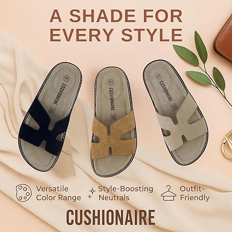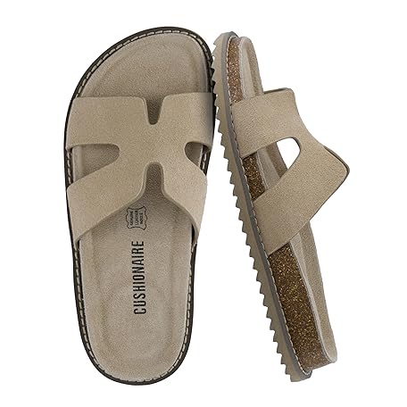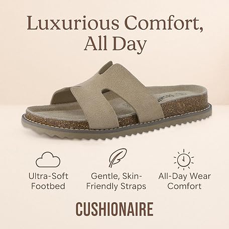 • CUSHIONAIRE Wisdom Womens Sandals Cutout Strap Genuine Leather Slides – Slip On Cork Footbed Sandals for Women 2025