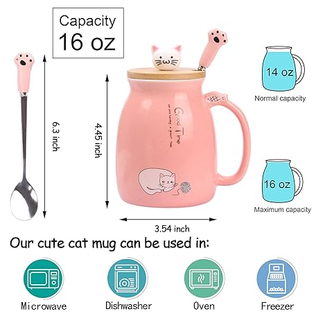 Thông tin sản phẩm Cute Cat Mug for Women, Girls, and Kids - Coffee Cup with Kitty Lid and Paw Spoon - Cat Lovers Gift - Pink
