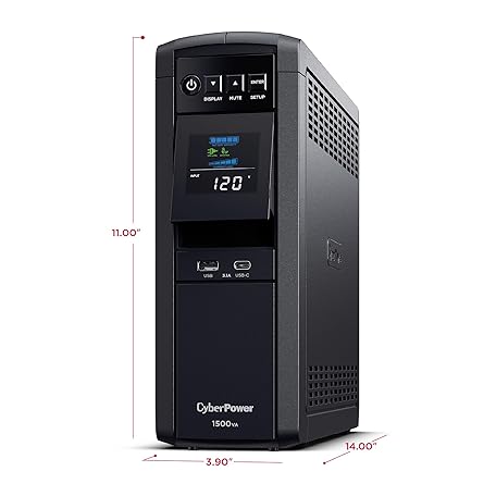 Thông tin sản phẩm CyberPower CP1500PFCLCD PFC Sinewave UPS Battery Backup and Surge Protector, 1500VA/1000W, 12 Outlets, AVR, Mini Tower; UL Certified