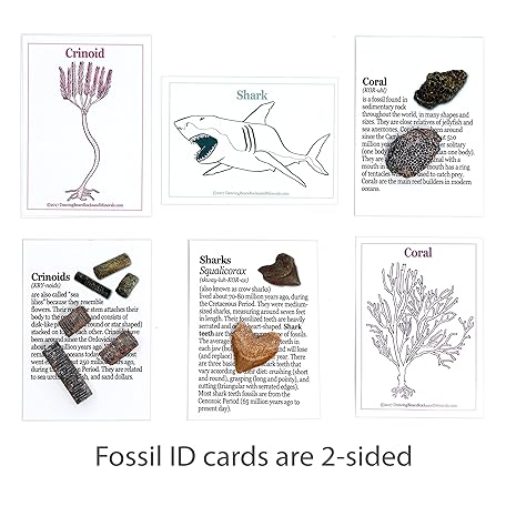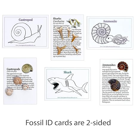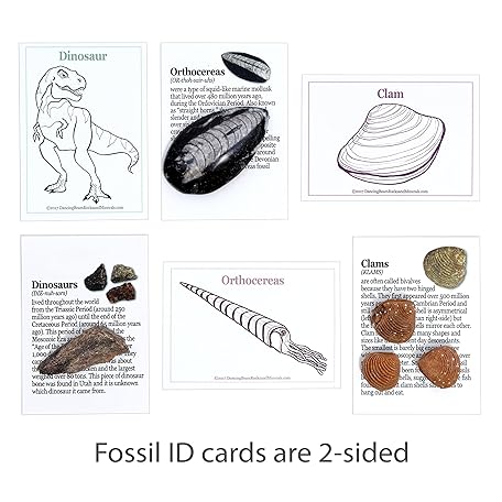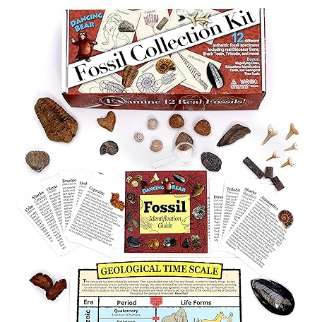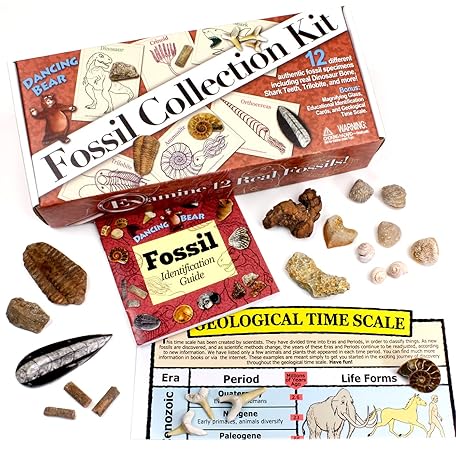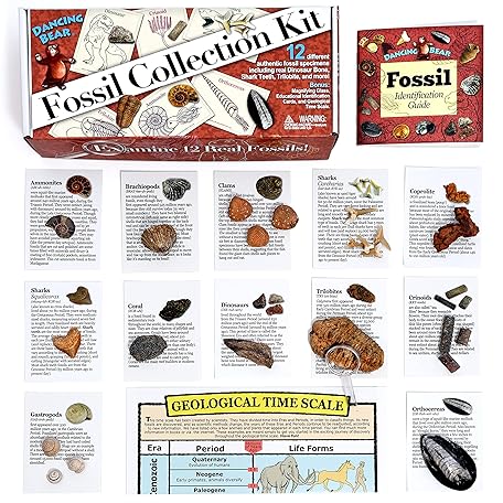 Thông tin sản phẩm DANCING BEAR Fossil Collection Kit (12 pc Set) Real Shark Teeth, Dinosaur Bone, Coprolite (Poop!), Fossil ID Book, STEM Science Set