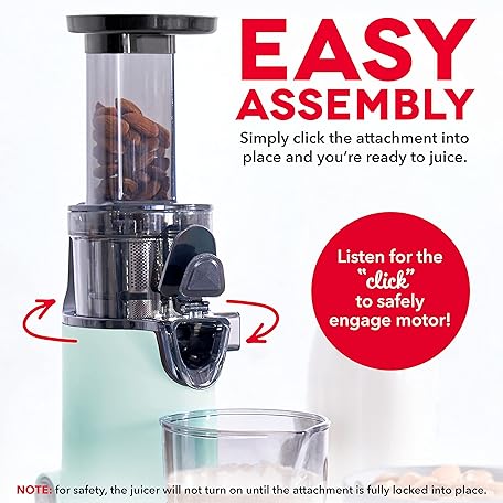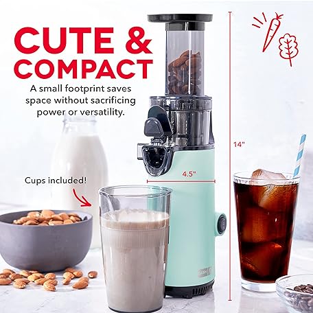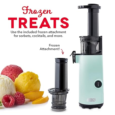 Thông tin sản phẩm DASH Deluxe Compact Masticating Slow Juicer, Easy to Clean Cold Press Juicer with Brush, Pulp Measuring Cup, Frozen Attachment and Juice Recipe Guide - Aqua