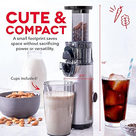 Thông tin sản phẩm DASH Deluxe Compact Masticating Slow Juicer, Easy to Clean Cold Press Juicer with Brush, Pulp Measuring Cup, Frozen Attachment and Juice Recipe Guide - Graphite