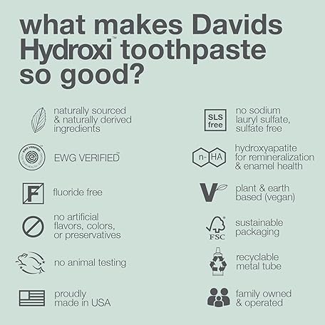 Thông tin sản phẩm Davids Hydroxi Fluoride Free Nano Hydroxyapatite Whitening + Enamel Health Toothpaste, Antiplaque, Fresh Breath, Remineralizing, SLS Free, Natural Peppermint, 4 oz, Made in USA