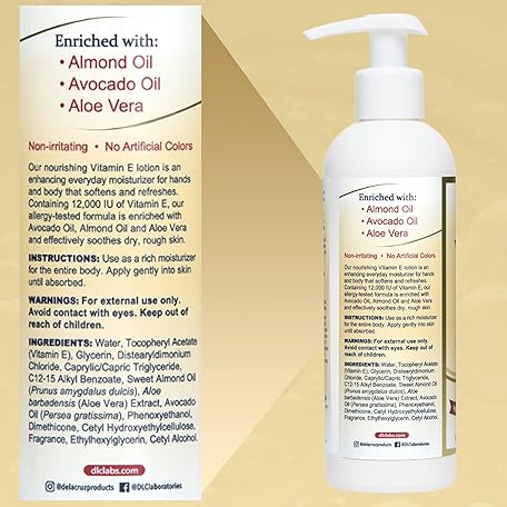 Thông tin sản phẩm De La Cruz Vitamin E Lotion for Dry Skin 12,000 IU with Avocado Oil, Almond Oil & Aloe Vera.vitamin e moisturizer, Moisturizing body lotion and face lotion for All Skin Types 8 FL OZ Made in USA