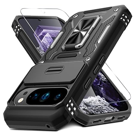 DEERLAMN Case for Google Pixel 10 Pro XL with Slide Camera Cover+Screen Protector(1 Pack), Rotated Ring Kickstand Military Grade Shockproof Protective Cover-Black