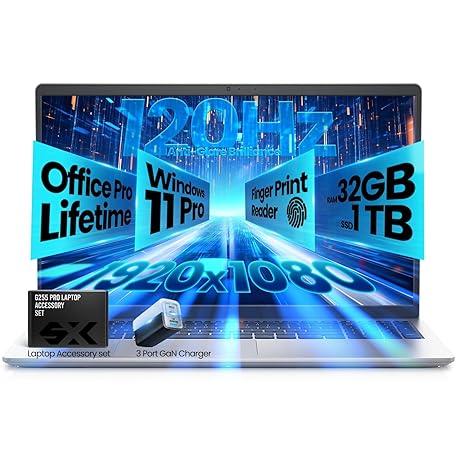 Dell 15.6-Inch Business&Student Laptop - Intel Core i7-1355U AI-Optimized, 15.6" FHD 120Hz, Backlit KB, Fingerprint Reader w/Windows 11 Pro, Office Pro Lifetime & GAN Charging, 32GB RAM | 1TB SSD