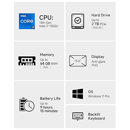Thông tin sản phẩm Dell Inspiron 15 3530 Touchscreen Laptop, 15.6" FHD Anti-Glare Display, Intel Core i7-1355U (Up to 5.0GHz), 32 GB RAM, 1 TB SSD, Intel Iris Xe GPU, Webcam, Wi-Fi 6, Windows 11 Pro
