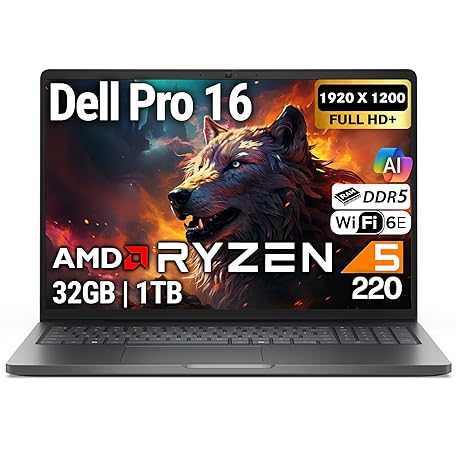 Dell Pro 16 FHD 16" Display Business Laptop, AMD Ryzen 5 220, 32GB DDR5 RAM, 1TB SSD PCIe, Backlit Keyboard, WiFi 6E + BT, RJ-45, HDMI, AI PC, HD Webcam, Windows 11 Pro - Magnetite Black