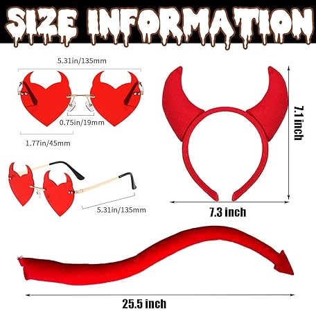 Demon halloween Devil Costume Set, Devil Horns Headband and Devil Tail and Devil Horns Heart Sunglasses Halloween Devil Demon Cosplay Costume Party