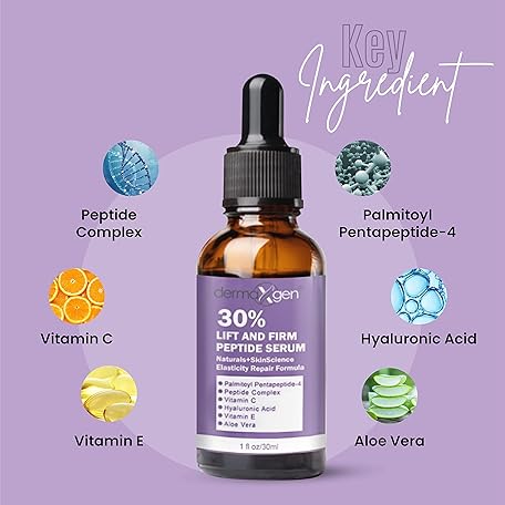 Thông tin sản phẩm Dermaxgen Lift And Firm - 30% Peptide Serum, Matrixyl 3000, Vitamin C & E + Hyaluronic Acid + Aloe Vera, Lifts, Firms & Tightens Skin + Pure Organic Anti-aging Serum (1 FL OZ)