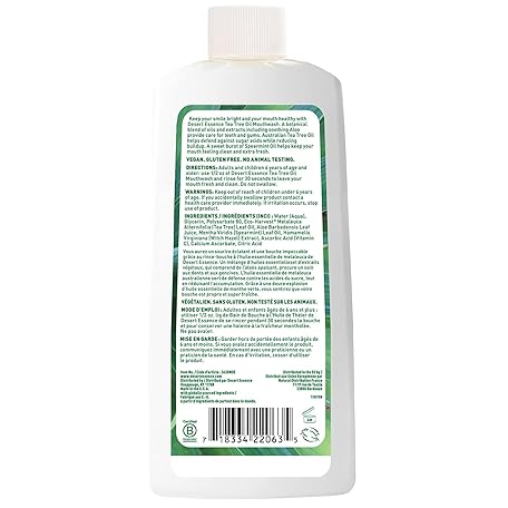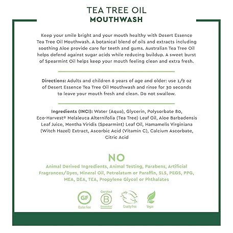 Thông tin sản phẩm Desert Essence Alcohol-Free Mouthwash with Tea Tree Oil and Aloe, Sugar-Free, Oral Rinse to Provide Botanical Care for Teeth & Gums, Vegan, Non-GMO, SLS-Free, Gluten-Free, Spearmint Flavor, 8oz