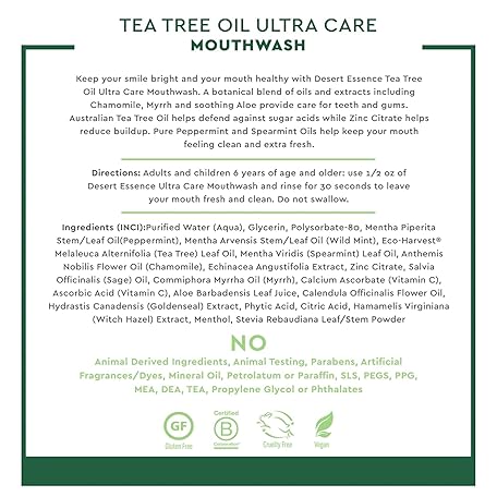 Sản phẩm Desert Essence Natural Tea Tree Oil Ultra Care Mouthwash - Mega Mint - 16 Fl Oz - Freshens Breath - Defends Against Sugar Acids - Vitamin C - Soothes Gums - Whitening Floss - Removes Food Debris đang được bán với giá ưu đãi là $14.1591 tại nước Mỹ.