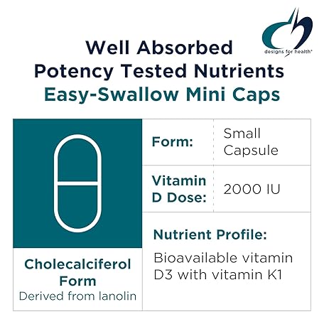 Thông tin sản phẩm Designs for Health Vitamin D Synergy - 2000 IU Vitamin D with K Supplement - Supports Healthy Moods, Bone Health + Immune Health for Adults - VIT D3 + Vitamin K - Gluten Free + Non-GMO (120 Capsules)