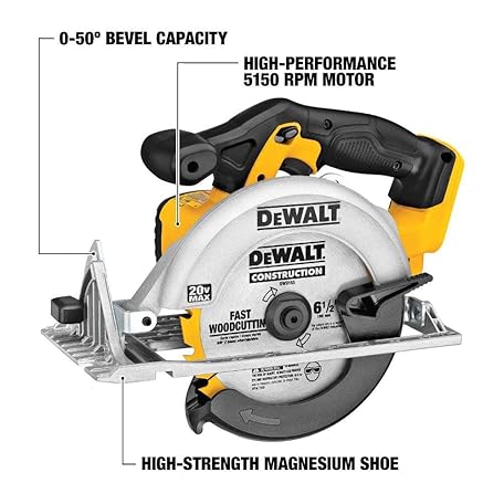 Thông tin sản phẩm DEWALT 20V MAX Circular Saw, Cordless Sidewinder Style Portable, 6-1/2-Inch Blade, 5150 RPM, 0-50 Degree Bevel Capability, Battery Not Included (DCS391B)