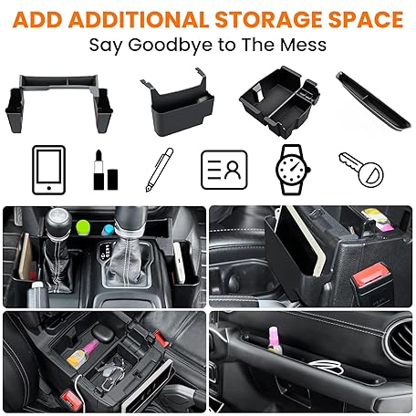 DIAMOOKY DIAMOOKY 4PCS Upgraded Center Console Organizer for Jeep Wrangler JL JLU 4xe 2018-2025 & Gladiator JT 2020 2021 2022-2025 Accessories Gear Shift Side Tray Hanging Armrest Storage Box (Not for JK/JKU)