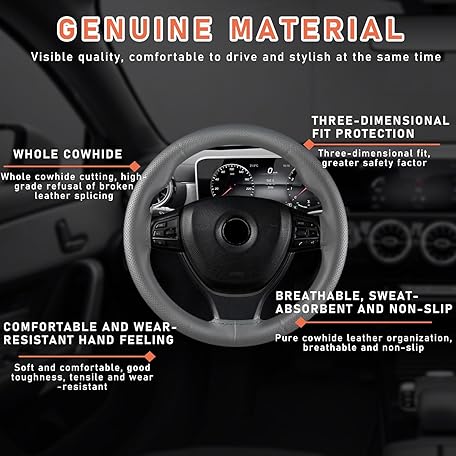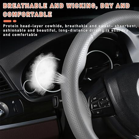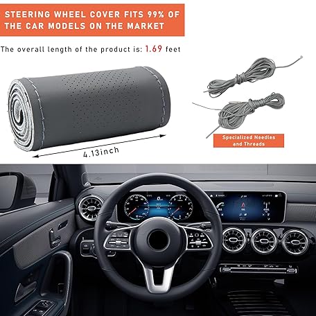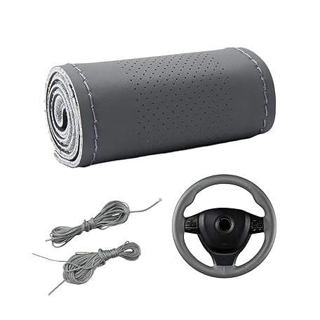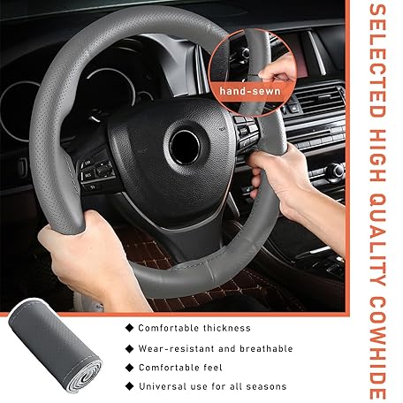 Dickno Car Steering Wheel Cover, Anti-Slip Stitch on Wrap Steering Wheel Protector for Max Diameter 15 Inch, DIY Sewing with Needle Thread, Universal Auto Accessories (Gray, Middle Hole)