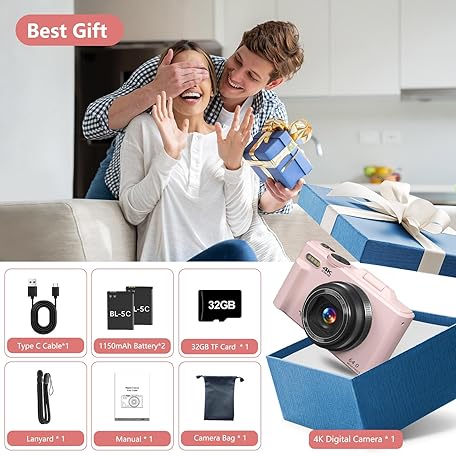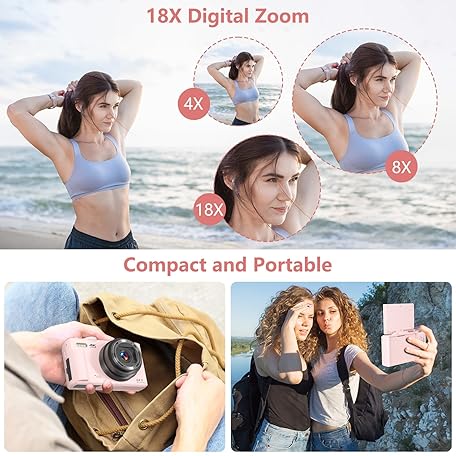 Thông tin sản phẩm Digital Camera for Photography, 4K Vlogging Camera for YouTube 3" 180° Flip Screen 18X Digital Zoom Compact Cameras with 32GB TF Card & 2 Batteries, Pink