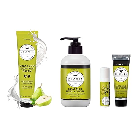 Dionis Goat Milk Skincare Bundle - Crisp Pear Body Lotion (8.5 oz), Travel Hand & Body Cream (3.3 oz), and Hand Cream & Lip Balm Set, Nourishing Care for Dry & Sensitive Skin, Cruelty-Free, Paraben-Fr
