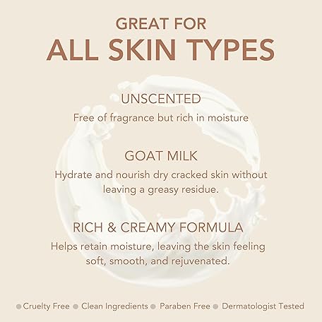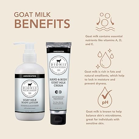 Thông tin sản phẩm Dionis Goat Milk Skincare Unscented 8.5oz Hydrating Body Lotion & 3.3oz Hand & Body Nourishing Travel Size Cream Fragrance Free Bundle, Natural Ingredients, Made in the USA, Cruelty Free, Paraben Free